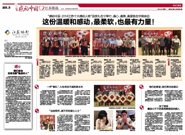 昨天下午,“感动中国·2014江苏十大感动人物”颁奖礼在南京举行。这是现代快报第三年和央视合作,开展 “感动中国·江苏感动人物”推选活动,3年时间里,我们因这些伟大的平凡人而感动,我们从他们身上感受到了满满的正能量。昨天短短一小时的颁奖礼,简朴而庄重。感动人物们多年的默默奉献、他们平凡朴实的话语,都让所有人感佩唏嘘,肃然起敬。